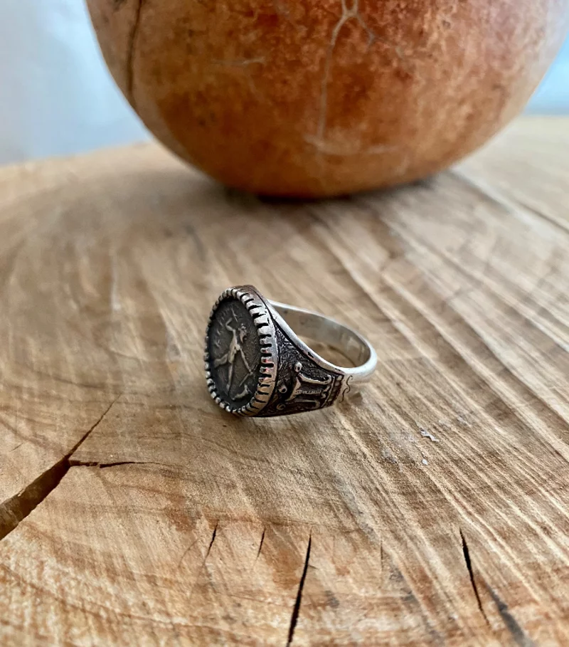 Anello Romeo tutto in argento 925 fatto a mano, con copia di moneta antica di Petelia .Il manufatto viene fuso con il metodo della cera persa, realizzato nel nostro laboratorio in Via Venezia ,17 in Crotone. Italy Modelli esclusivi della Antichità greca Bruttium, Bretti, quarta monetazione c. 214-211 A.C. ZEUS CHE SCAGLIA LA SAETTA.